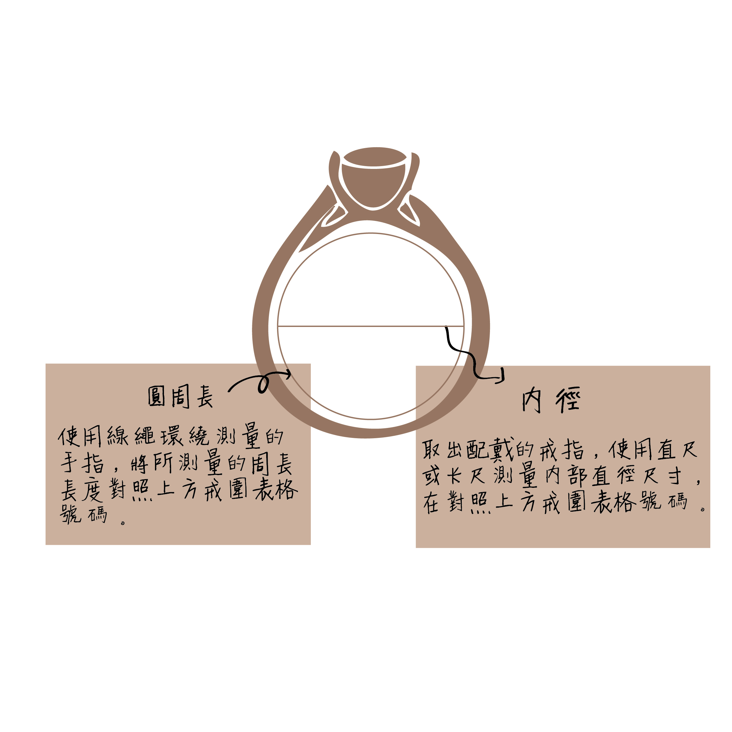 • 內徑 - 測量戒指內部的直徑尺寸,可依測量尺寸對照上方戒圍號碼